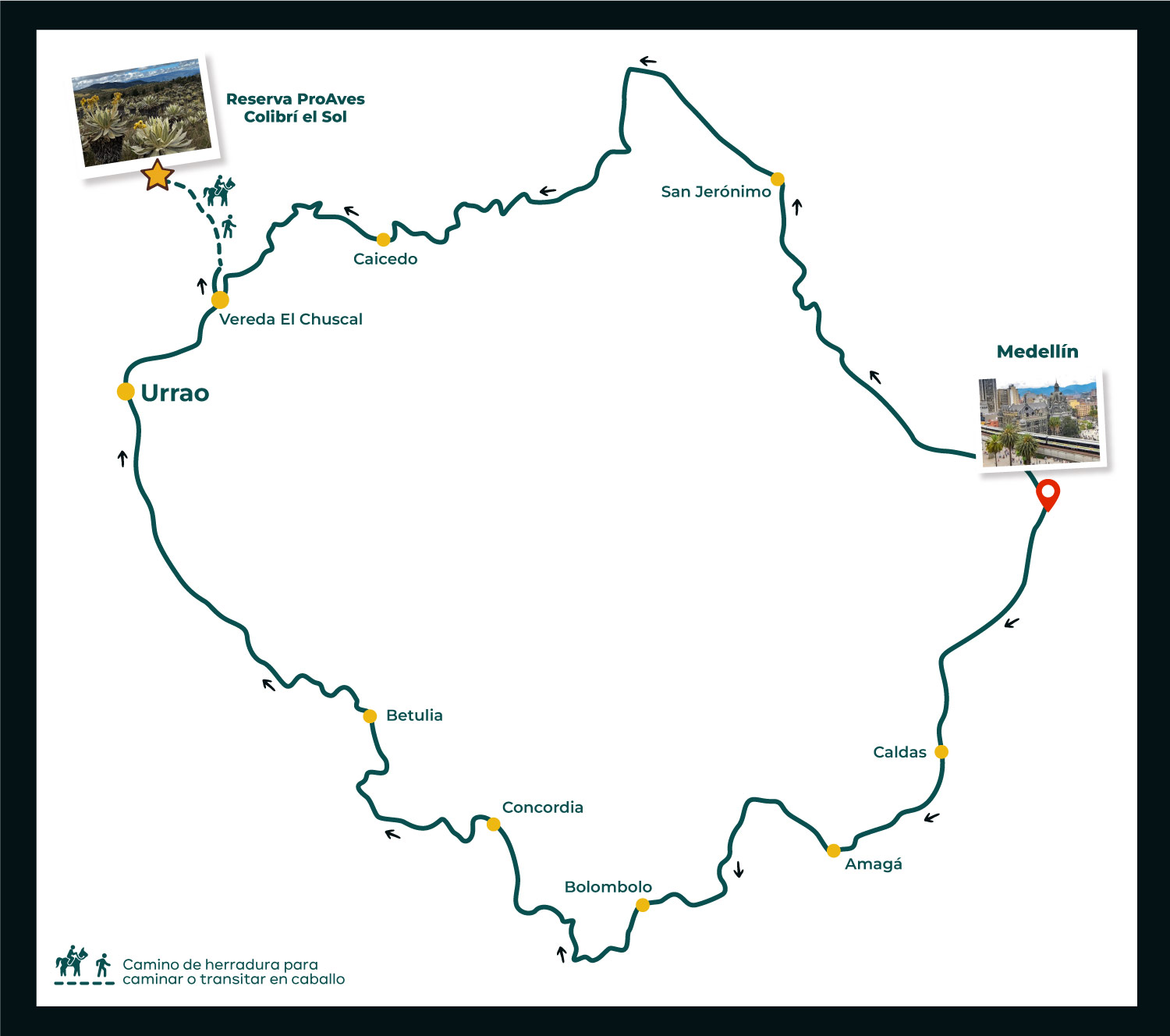 Any vehicle is suitable for transportation to the village of El Chuscal, in the municipality of Anorí. The car can be left at a point known as La Terminal. From that point, to the Nature Reserve, you must take the bridle path, either on foot or on horseback (prior coordination with a service provider is required), this journey is 5 km long and takes approximately 3 hours.