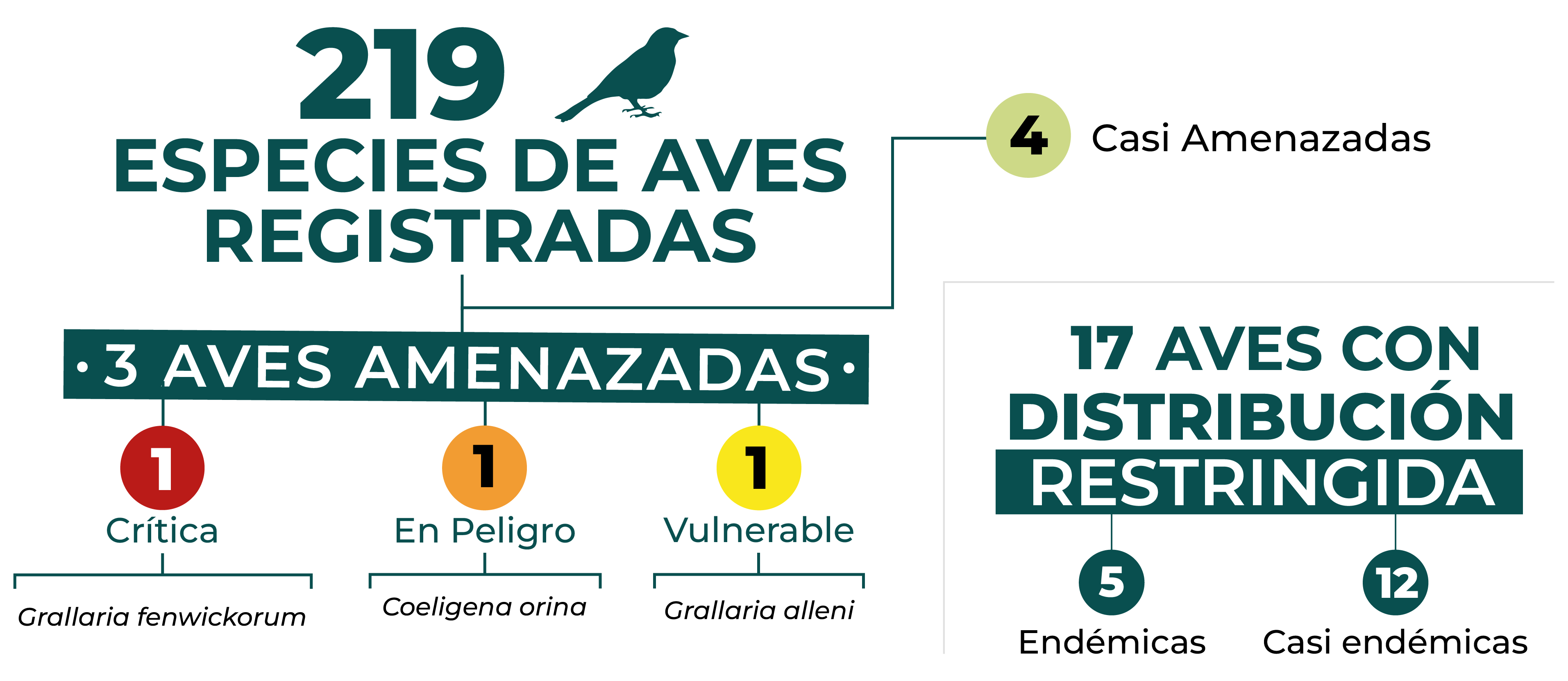The Nature Reserve is home to 371 species of birds, among which stand out Coeligena orina (EN), Hapalopsittaca amazonina (VU), Diglossa gloriosissima (VU), Grallaria alleni (VU), Grallaria alvarezi (EN) and Grallaria urraoensis (CR).