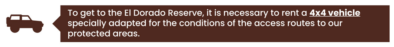 To get to the El Dorado Reserve, it is necessary to rent a 4×4 vehicle specially adapted for the conditions of the access routes to our protected areas.