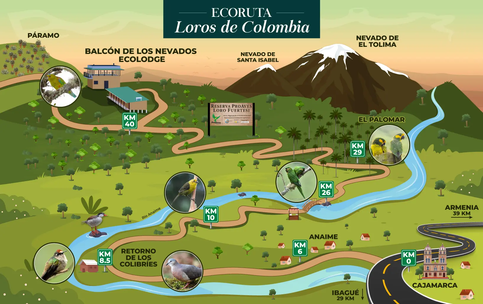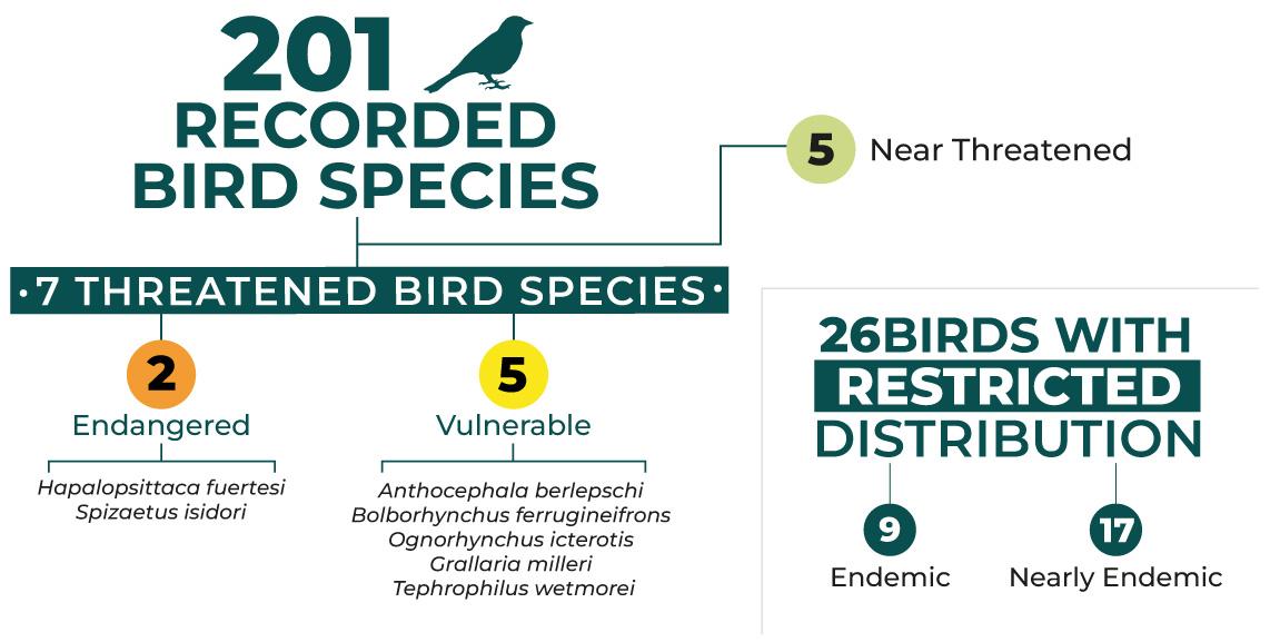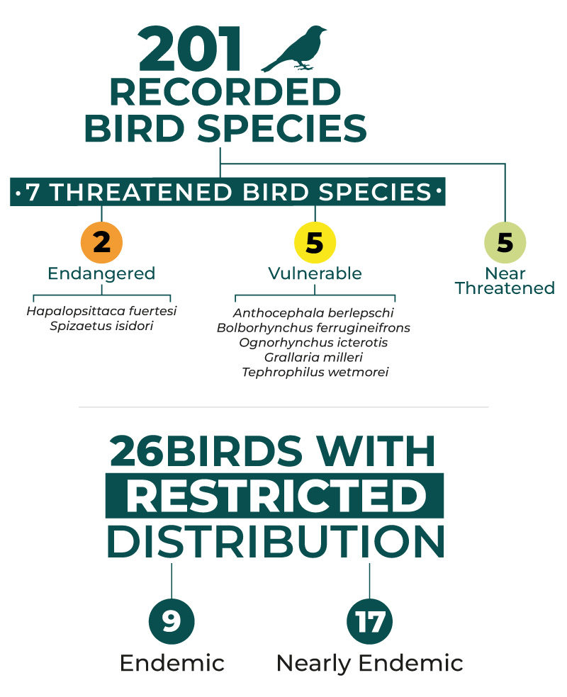 The Reserve is the habitat of 5 threatened parrot species, including 3 endemic to Colombia: the Yellow-eared Parrot (Ognorhynchus Icterotis) (CR), Blue-crowned Parrot (Hapalopsittaca fuertesi) (CR) and the Frentirrufo Parakeet (Bolborhynchus ferrugineifrons) (VU); We also preserve the Paramuno Parakeet (Leptosittaca branickii) (VU), and the Montañera Parakeet (Hapalopsittaca amazonina) (VU). Additionally, we find populations of large mammals such as the spectacled bear, the mountain tapir and the deer.
