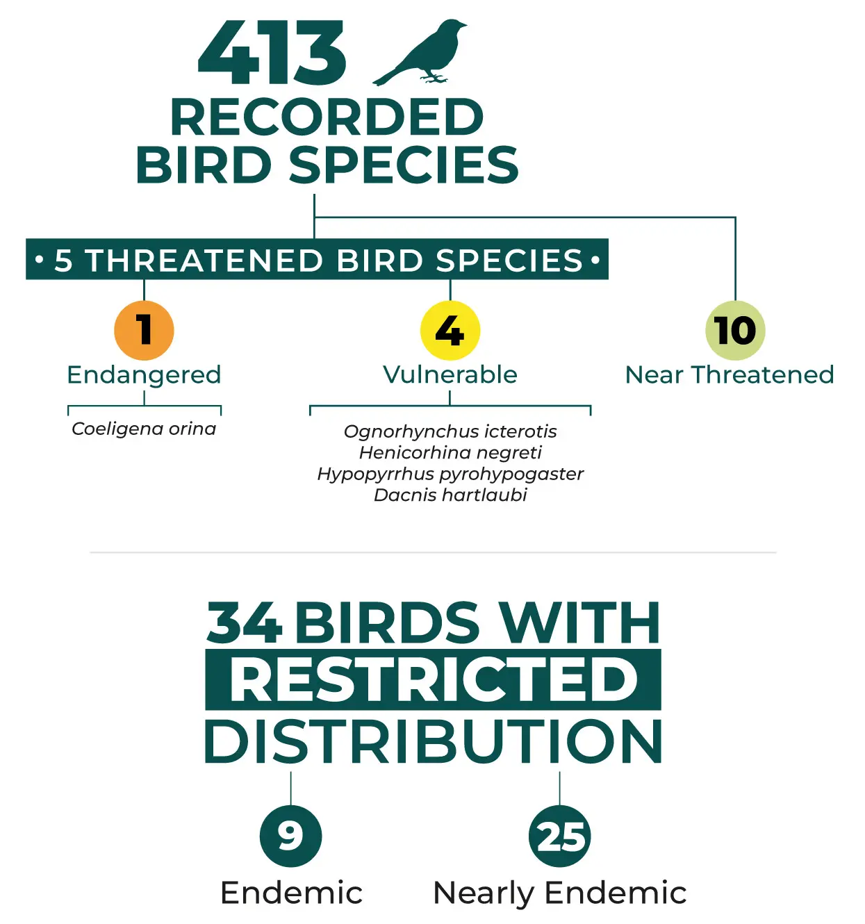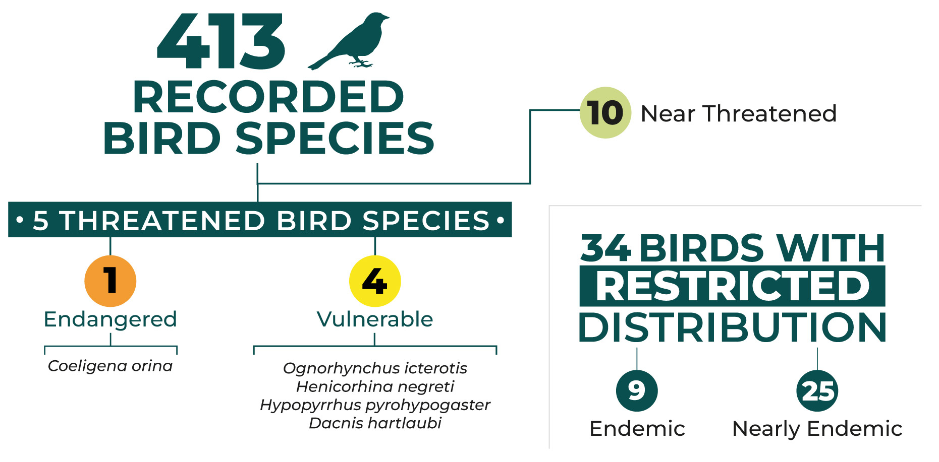 The most important bird species for conservation are the Yellow-eared Parrot (Ognorhynchus icterotis) and the Frontino Hummingbird (Coeligena orina), among others.